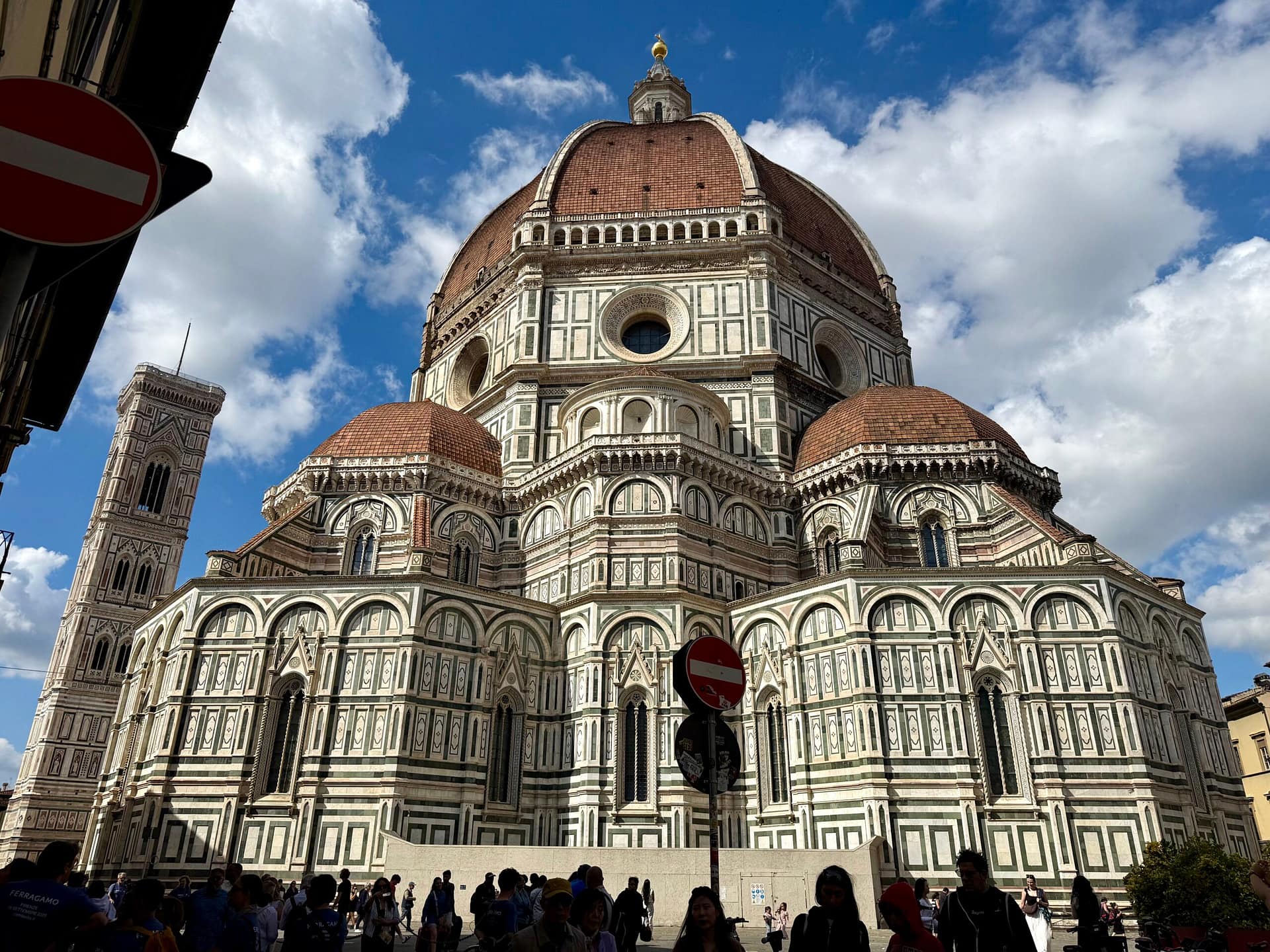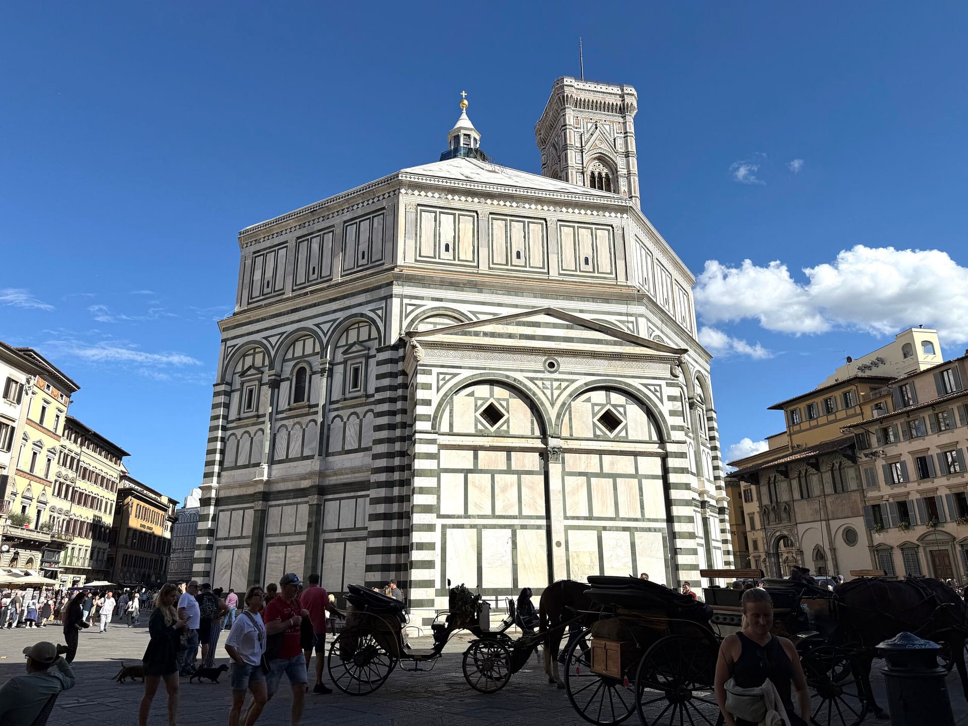 I smiled, questioning if this was still a dream, and realizing that the distinction hardly mattered. To stand before this masterpiece is to enter a dialogue with the architect himself. I spent an hour circling the exterior, walking, pausing, and resisting the urge to join the queues. For this encounter, the exterior alone offered a sufficient sensory richness. The interplay of white Carrara, green Prato, and red Siena marble is a study in restraint and order. Together with Giotto’s Campanile, the ensemble forms a harmonious heart that beats with the early Renaissance.
