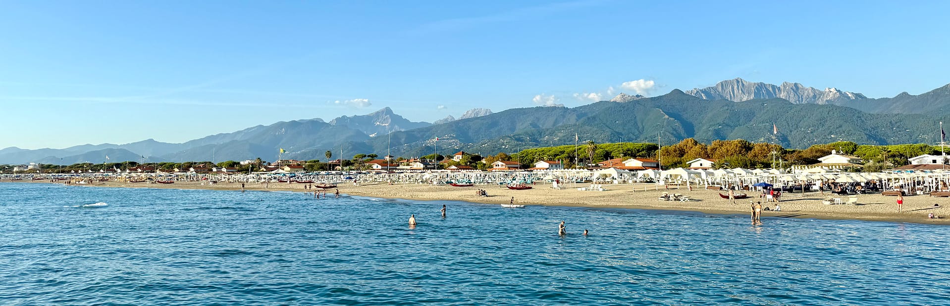 As evening approached, I stepped onto the beach. Its soft golden sand stretched endlessly along the shore, and standing on the pier, facing the vast Mediterranean Sea, I could not help but glance back toward the Apuan Alps, where another form of purity rose: marble-dusted mountains in majestic continuity. Between the sea and the mountains, rows of umbrellas stood as a distinctly human landscape. I enjoyed the comfort of warm, clear weather as I wandered barefoot along the water’s edge, watching the sun slowly sink into the horizon.