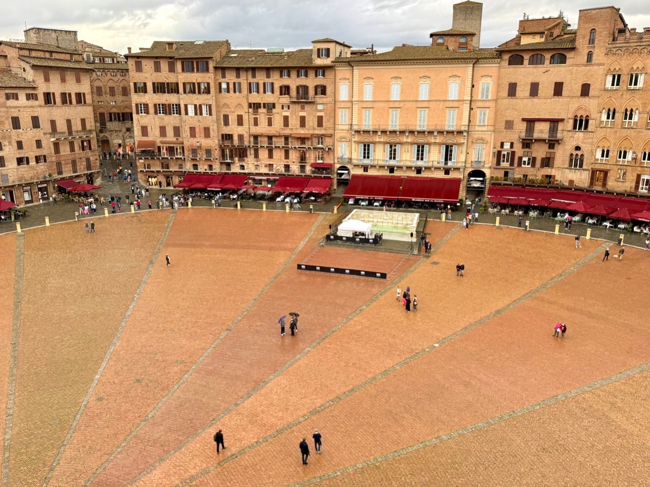 As I ascended the tower, the rain began to fall, echoing the moment I experienced at the tower in Pisa, a gift that offered me a different perspective. From above, the empty square glistened, the moisture deepening the hues of the brick from a sun-bleached to a saturated burnt-sienna. The city assumed an ancient weight, more authentically 14th-century in its solitude.