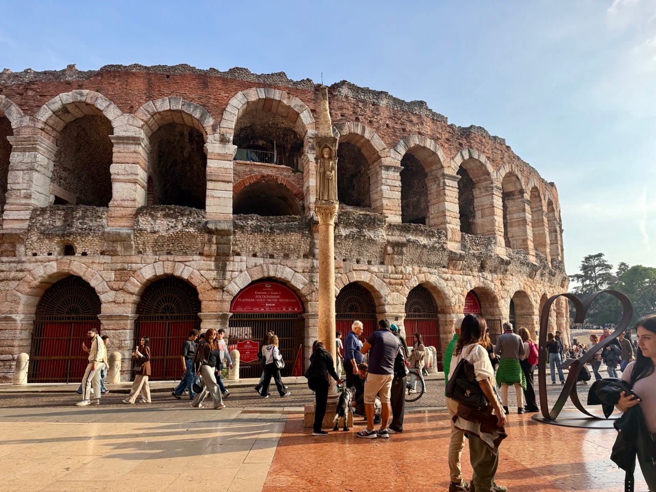 I wandered along the riverbank, immersing myself in local life. Further upstream stands Ponte Pietra, Verona’s oldest bridge, originally Roman and repeatedly reconstructed after floods and wars. Its stonework displays an evolution of texture and color along its arches, reflecting both ancient foundations and later interventions. Alongside the bridge, a landscaped riverside promenade guides pedestrians with gentle curves and carefully proportioned paving, offering pauses to admire the water and cityscape. Crossing the bridge leads toward Castel San Pietro, perched above the city; I did not climb to the castle this time, but even from the riverbank, Verona reveals itself as a harmonious composition of river bends, stone roofs, and distant hills, particularly breathtaking at the golden hour, accompanied by the city’s tolling bells that evoke a sense of medieval romance.